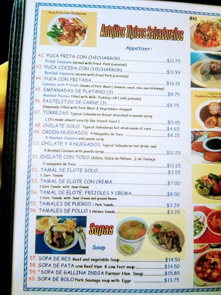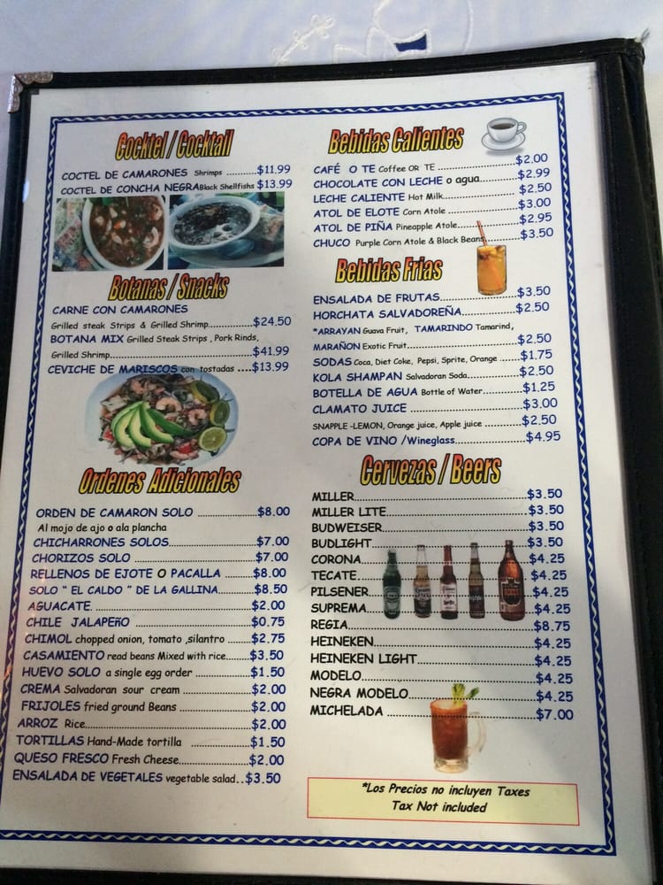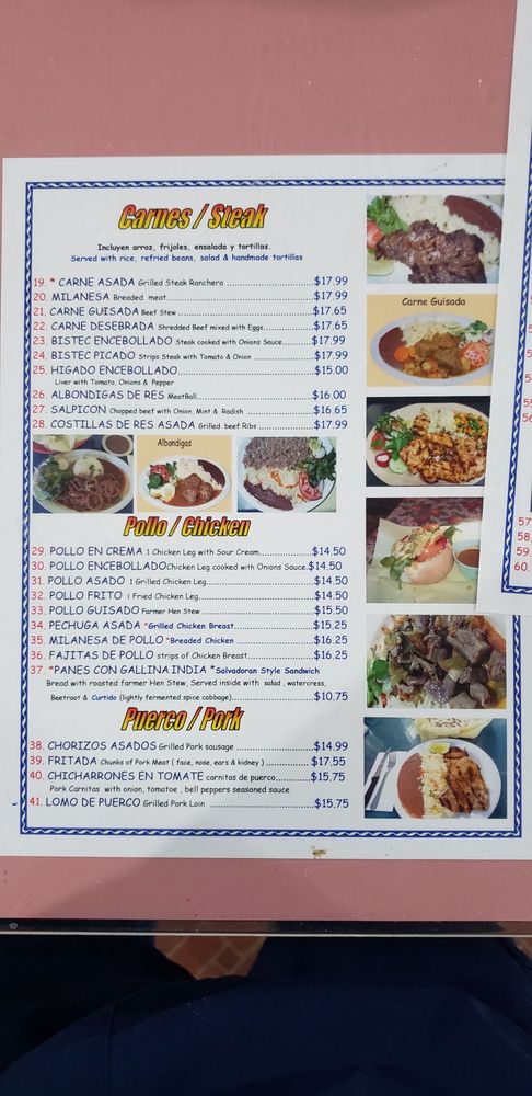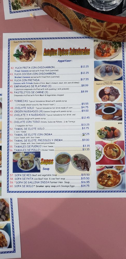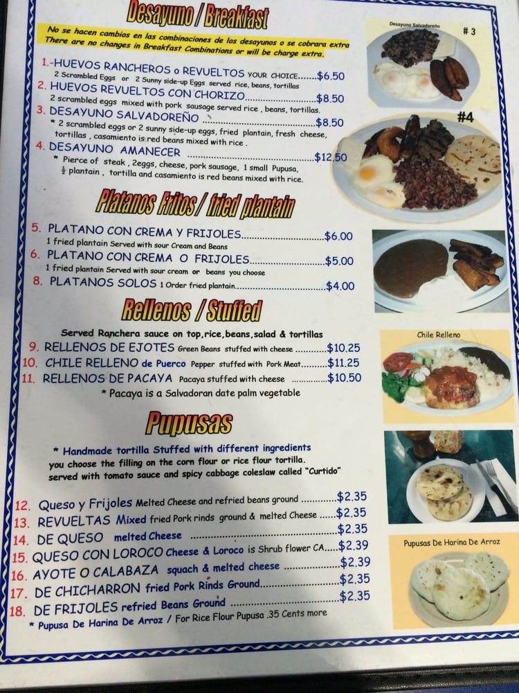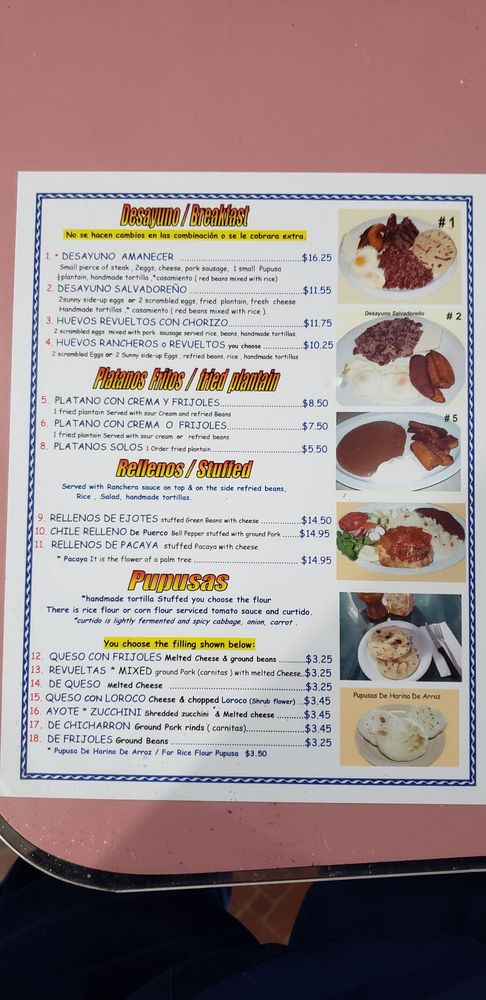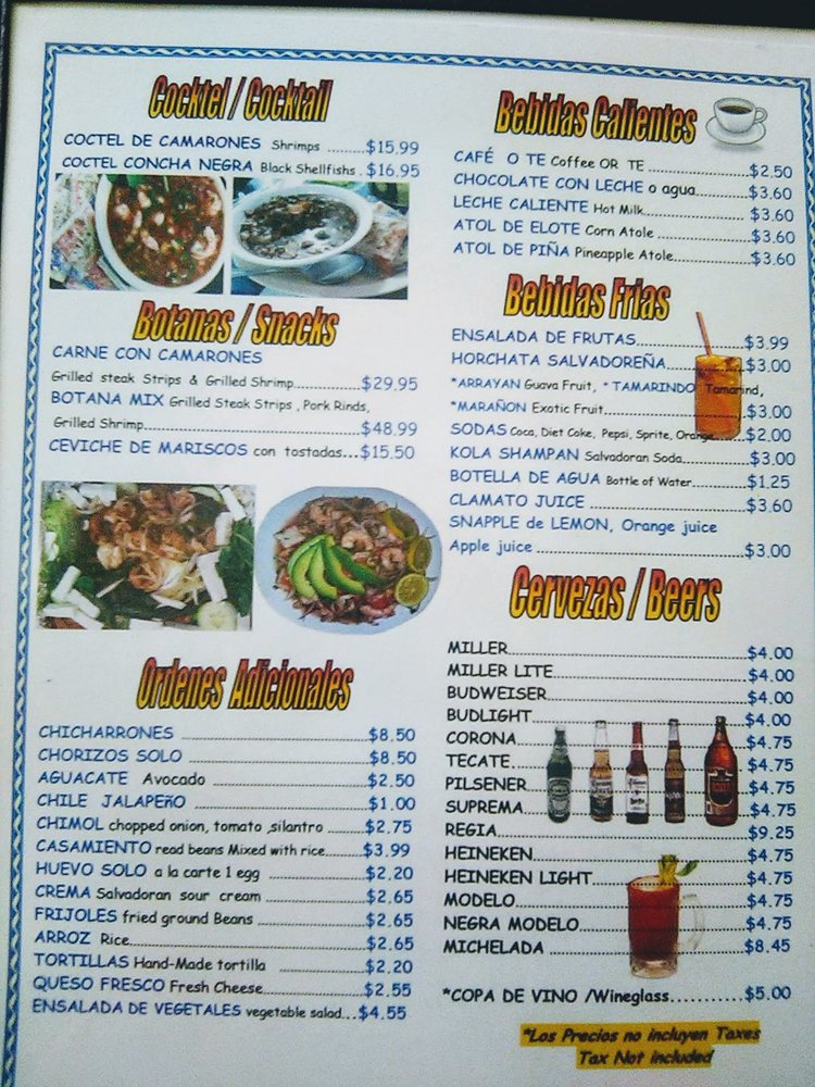 Introducing the menu at El Amanecer Salvadoreno, a Salvadoran restaurant located in Los Angeles, CA. This classy establishment offers a variety of options for diners, including takeout, delivery, and reservations. The menu boasts many vegetarian choices, making it ideal for groups or families with diverse dietary preferences. Customer reviews praise the delicious pupusas, breakfast dishes, soups, and ceviche, highlighting the exceptional flavors and generous portions. The ambiance is described as cozy, reminiscent of a home, with attentive service and a welcoming atmosphere. A must-try is the savory Salvadoreno sausage paired with plantains, beans, and crema, a true taste of authentic Salvadoran cuisine. Don't miss the chicken tamales for an additional burst of flavor. Parking may be a challenge, but the overall experience and quality of food make El Amanecer Salvadoreno a standout destination for those craving traditional Salvadoran fare.